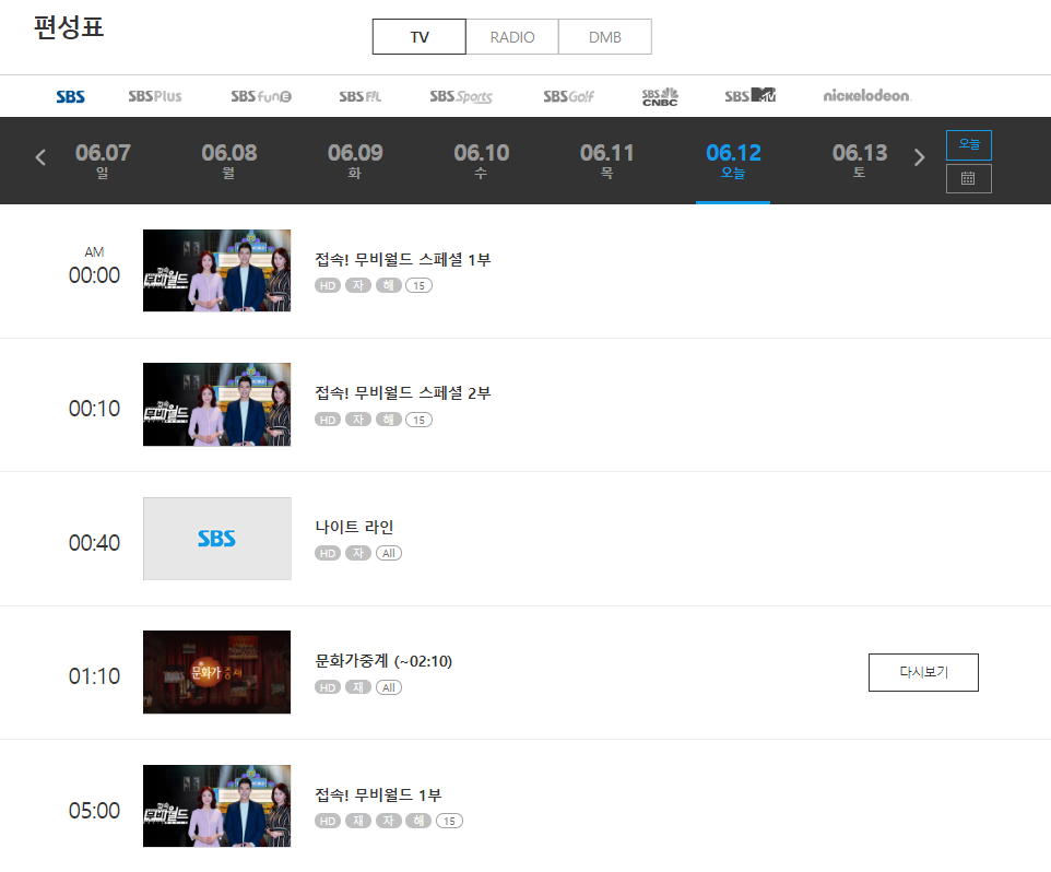 채널을 옮겨서 편성표를 확인해 시청하고 싶으신 시간을 알아두셨다고 바로 시청하실 수 있습니다.