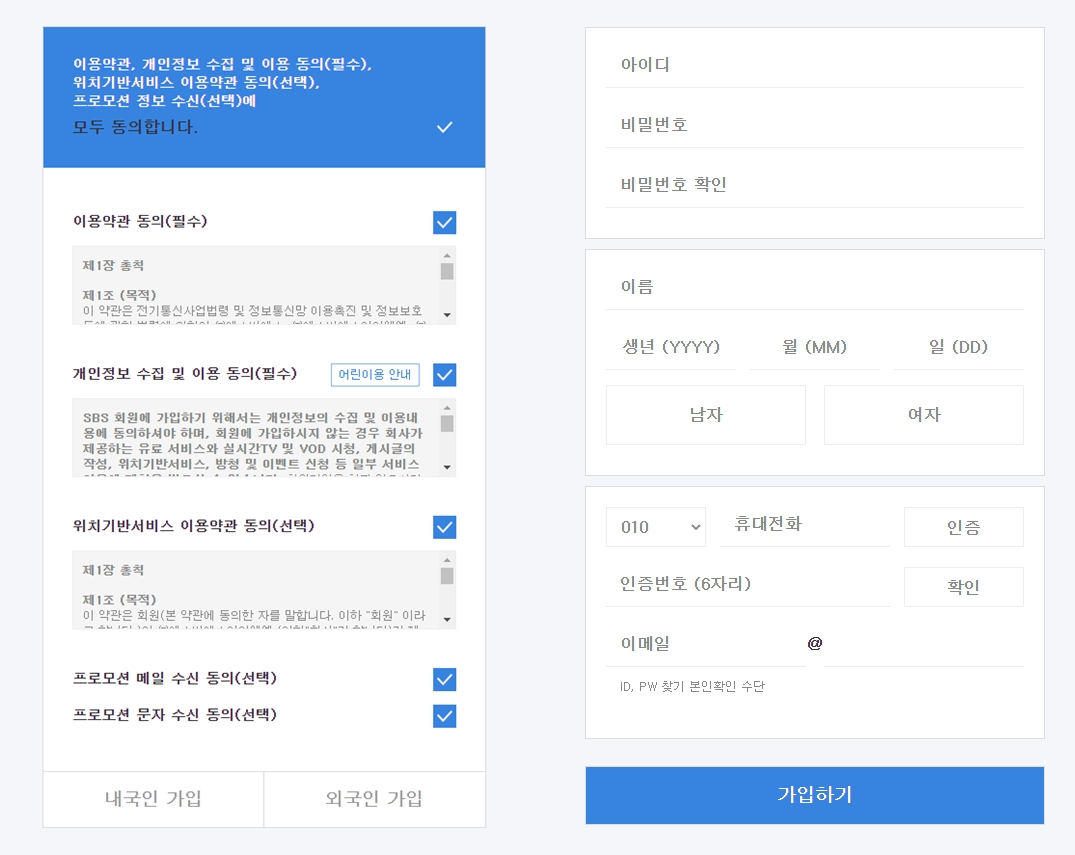 위 화면과 같이 페이지가 나오데요. 절차대로 작성하셔서 가입하시면 되고 다른 방송사들과 다르게 소셜 로그인은 사용되지 않습니다.