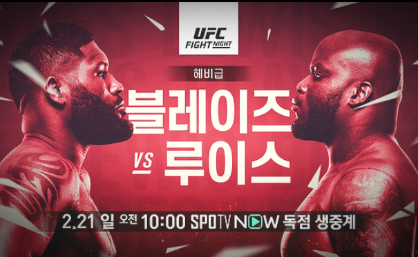 UFC 메인카드 경기는 2월 21일 오전 10시부터 진행됩니다. SPOTV ON 과 SPOTV NOW에서 독점 생중계합니다. 메인이벤트은 루이스와 블레이즈의 경기는 제일 마지막입니다. 언더카드 경기가 끝나면 메인카드 경기가 시작됩니다.