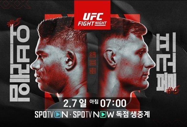 UFC 메인카드 경기는 2월 7일 오전 10시부터 진행됩니다. SPOTV ON 과 SPOTV NOW에서 독점 생중계합니다. 메인이벤트은 오브레임와 볼코프의 경기는 제일 마지막입니다. 언더카드 경기가 끝나면 메인카드 경기가 시작됩니다.