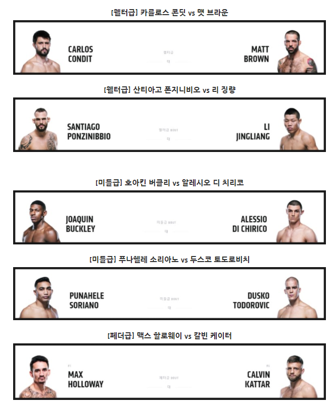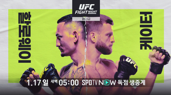 UFC 메인카드 경기는 1월 17일 낮 12시부터 진행됩니다. SPOTV ON 과 SPOTV NOW에서 독점 생중계합니다. 메인이벤트은 할로웨이와 케이타의 경기는 제일 마지막입니다.