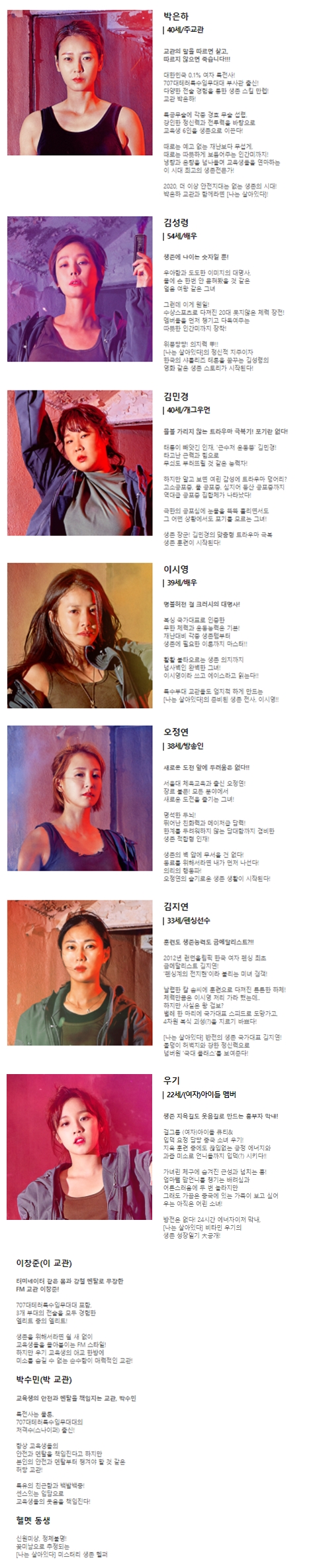 배우 김성령·이시영, 개그맨 김민경, 방송인 오정연, 한국 여자 펜싱 최초의 금메달리스트 김지연, (여자)아이들 우기가 특수전사령부(특전사) 중사 출신 박은하 교관으로부터 재난 탈출 훈련과 생존 팁을 배우고 최종적으로 독자 생존에 도전하는 과정을 담습니다.