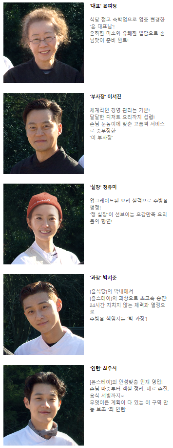 출연진 - 윤여정, 이서진, 박서준, 정유미, 최우식